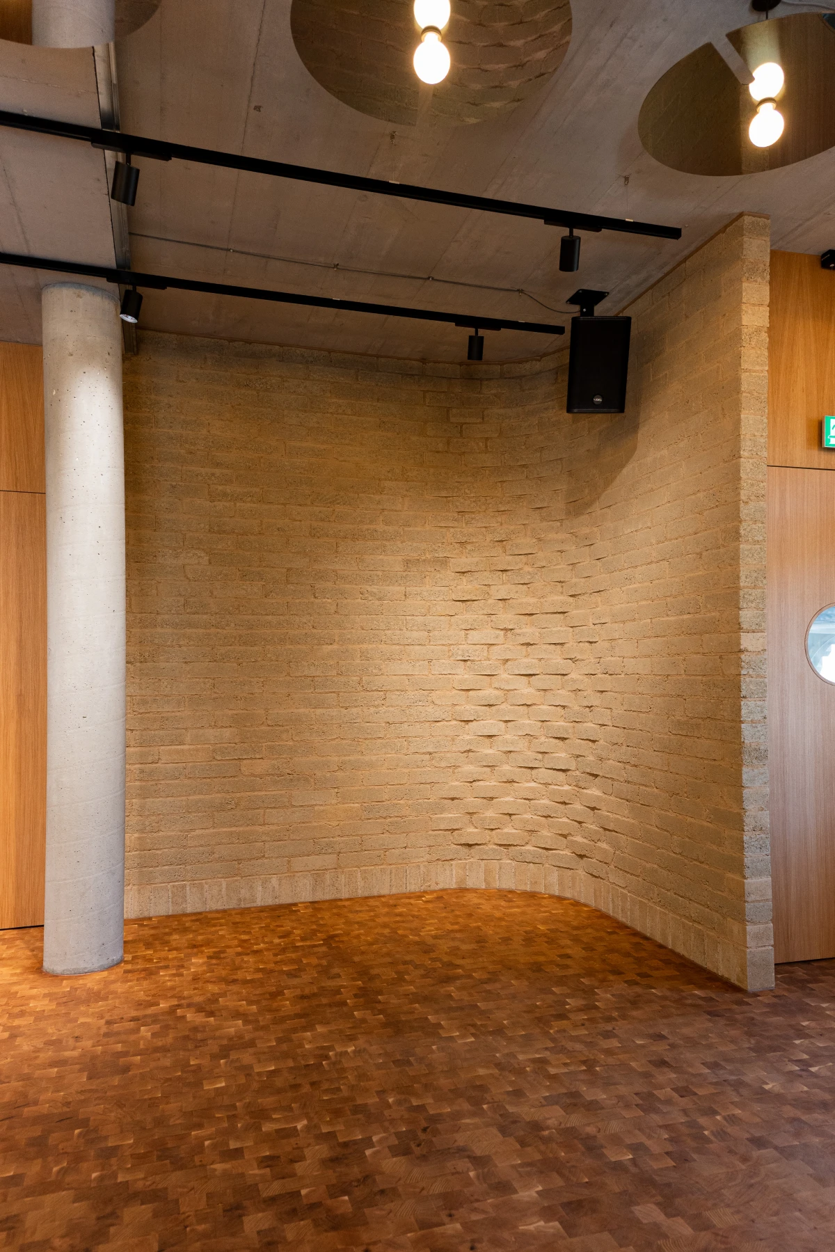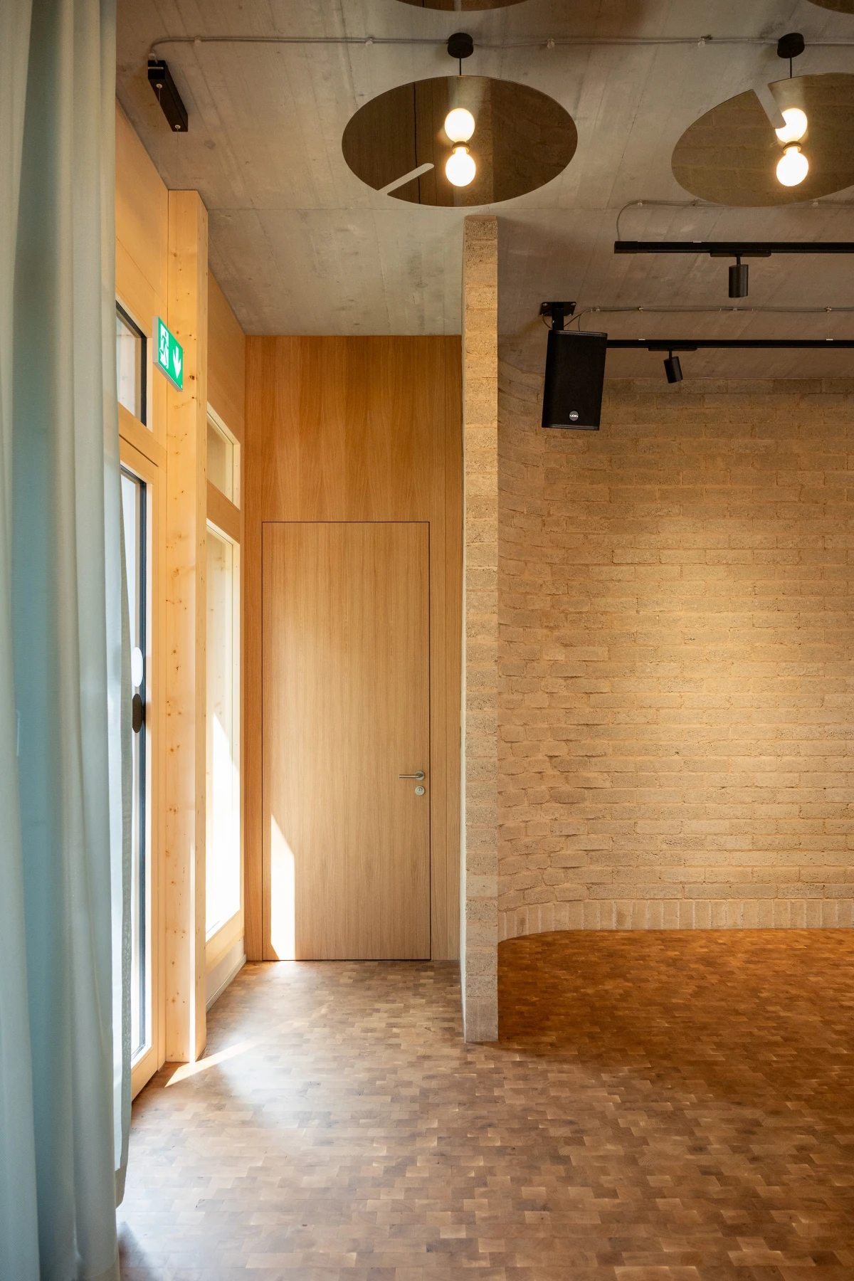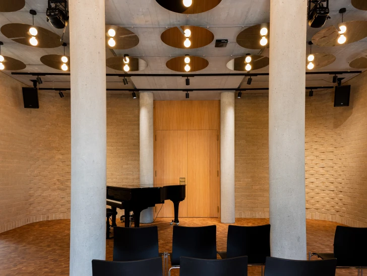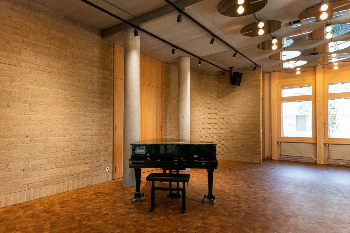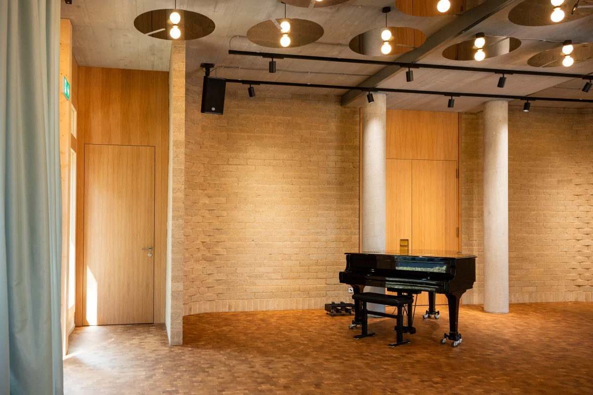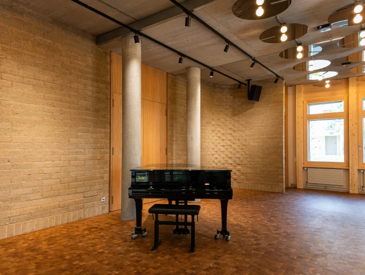 Um den Umbau und die Sanierung so ressourcenschonend wie möglich zu realisieren, setzen die Architekt:innen von Burckhardt auf gezielte Interventionen, wo sie notwendig sind. Überall dort, wo neue Materialien eingesetzt werden, sind diese weitestgehend natürlich, recycelt oder werden aus dem Bestand in neuer Form wiederverwendet. So wird eine gerundete Lehmziegelwand aus Oxablocs den zukünftigen Konzertsaal für bis zu 90 Personen in Szene setzen. Die gemeinschaftlich von Terrabloc und Oxara entwickelten Oxablocs werden mit Oxabrick® Loko, dem mineralischen Aktivator für stabilisierte gepresste Lehmsteine, hergestellt. Auf einer Fläche von rund 40m2 schaffen sie nicht nur für die Bühne einen optischen Rahmen. Die feuchtigkeitsregulierenden Eigenschaften der Lehmsteine sorgen zudem für ein gutes Raumklima an diesem Ort für Musik und Begegnung.