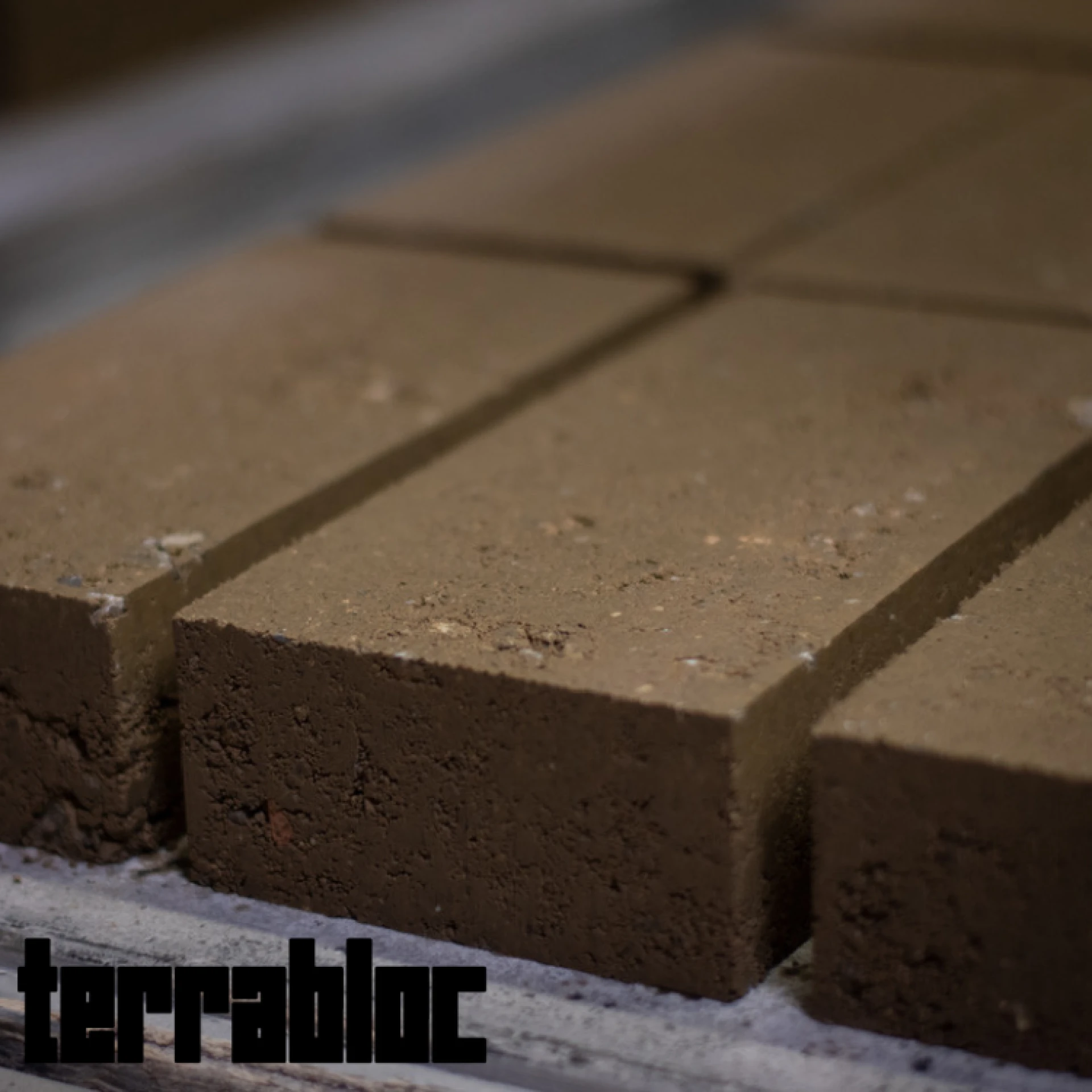 Stabilised compressed earth blocks made with natural clay and the Loko activator. Produced by Terrabloc, they offer a low-carbon alternative for interior walls and elements. The clay regulates humidity, creating a healthy indoor climate and a warm, natural atmosphere.