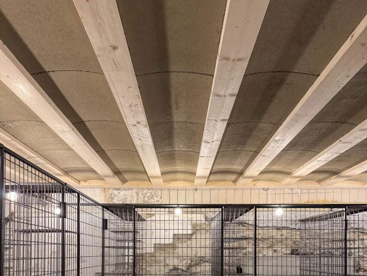 At Chäsimatt in Rotkreuz the area of a former dairy, Alti Chäsi, was repurposed for housing and small businesses. The original brick structures remain and offer a distinctive atmosphere to the premises. One of the old cellars was reconstructed for the use as a wine cellar for the tenants. This rental wine storage facility features a ceiling constructed through in-situ poured earth cast between existing timber beams, using Oxara's Oxacrete® Care. The earthen material was mixed and cast on-site using excavated material that otherwise would have been deposited on a landfill. The poured earth regulates the indoor climate smoothly. Thus, it proved ideally suited to the wine cellar's specific climate requirements, creating optimal storage conditions while respecting the building's historical context.