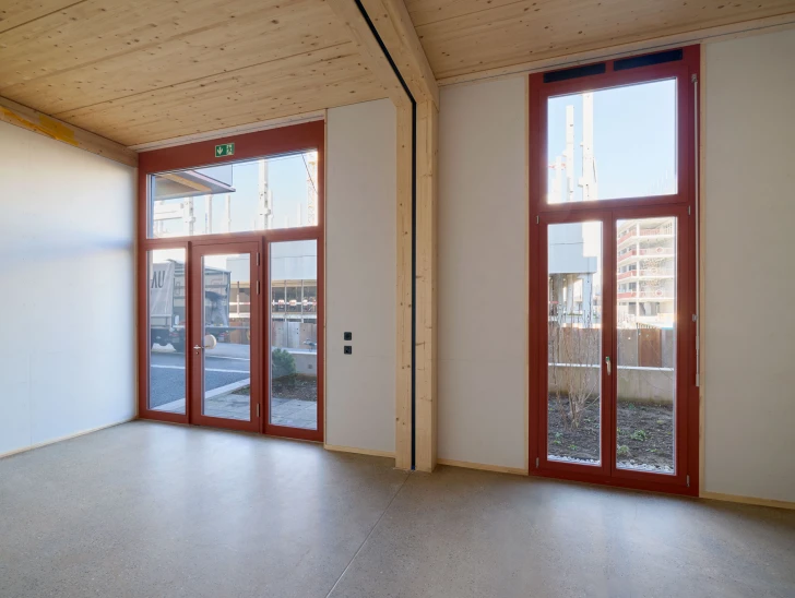The LysP8 residential and commercial building in Basel pairs timber construction with reuse design principles. Poured earth floors using Oxara's Oxacrete® Nossim were implemented in selected residential units, community spaces, and commercial areas. The poured earth floor was cast on cross-laminated timber slabs for the first time. In-situ acoustic testing showed equivalent performance compared to conventional screed systems. The project showed the usability of the product as it was produced in a concrete plant, delivered in a conventional concrete truck and pumped into place.