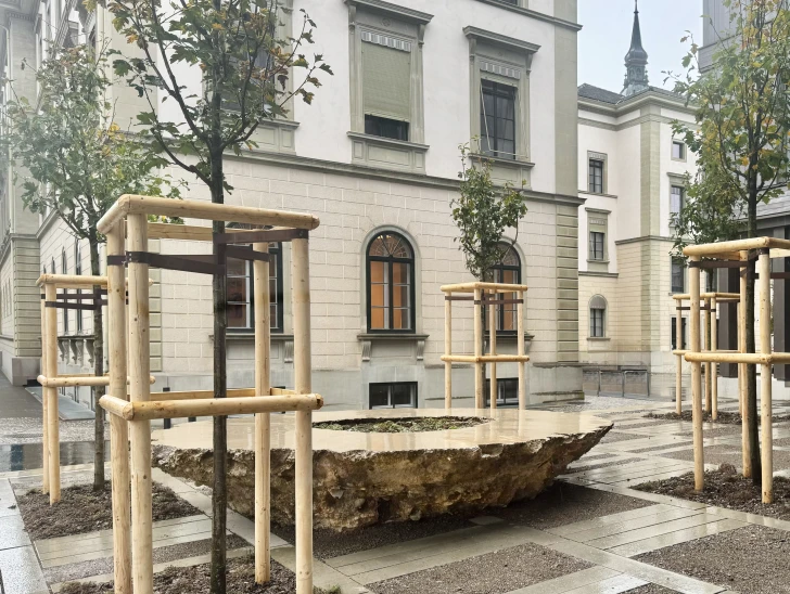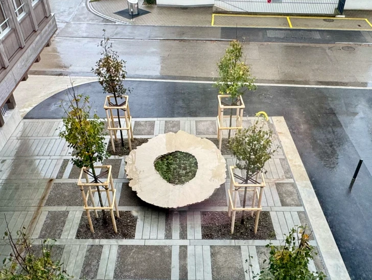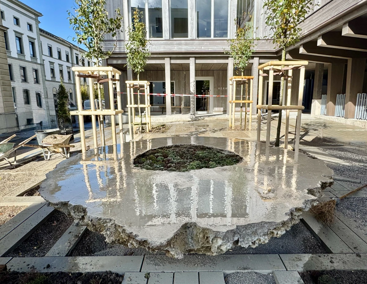 Together with artist Bob Gramsma and our industrial partner KIBECO, we explored this question at the government building in Frauenfeld. As part of the public art project round table, PD#24324, our cement-free Oulesse binder became an integral element of a large-scale sculptural installation.