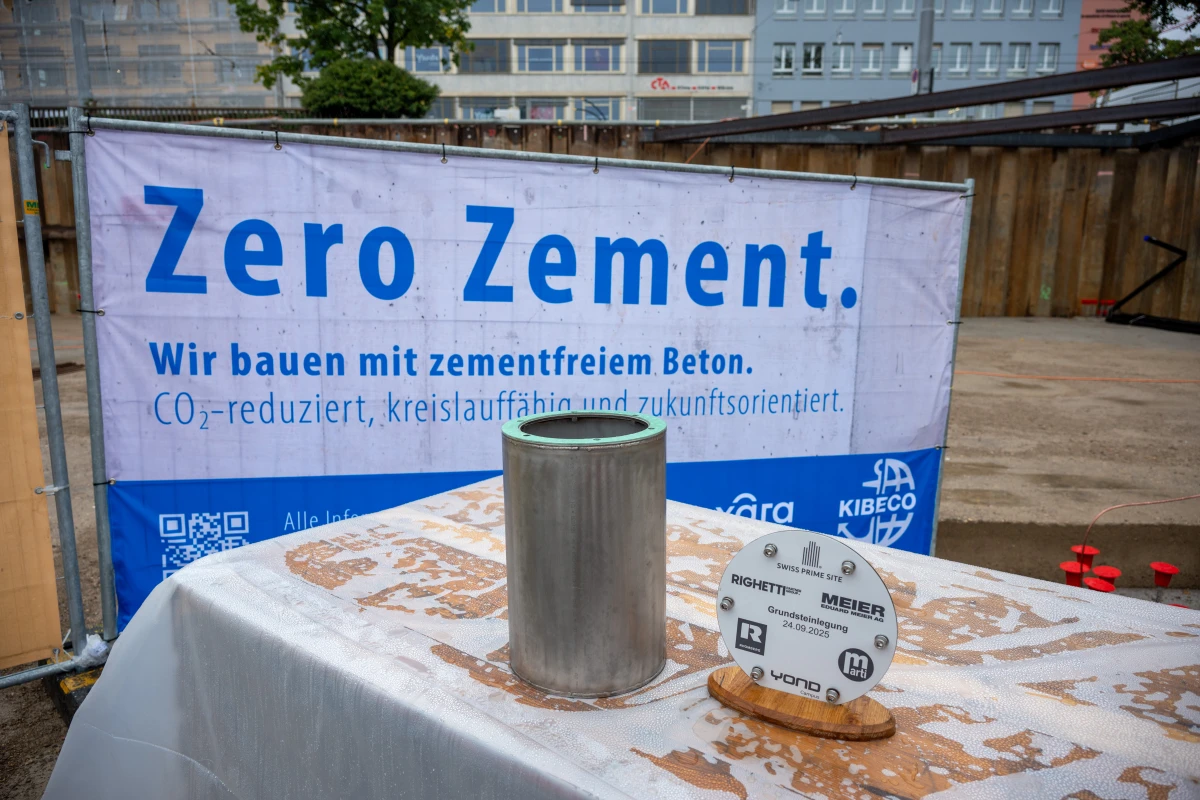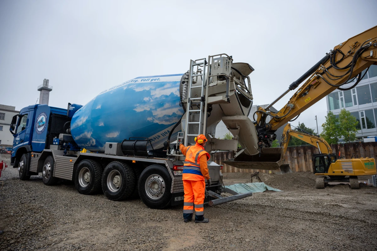 At the groundbreaking ceremony, a time capsule was embedded in the foundation - symbolising a future built on circular principles. For the foundation works, KIBAG produced 1,500 m³ of Migrox Oulesse® lean concrete, made with the Oulesse® binder. The material contains up to 95% processed construction and demolition waste, reducing CO₂ emissions by around 50% compared to conventional lean concrete.