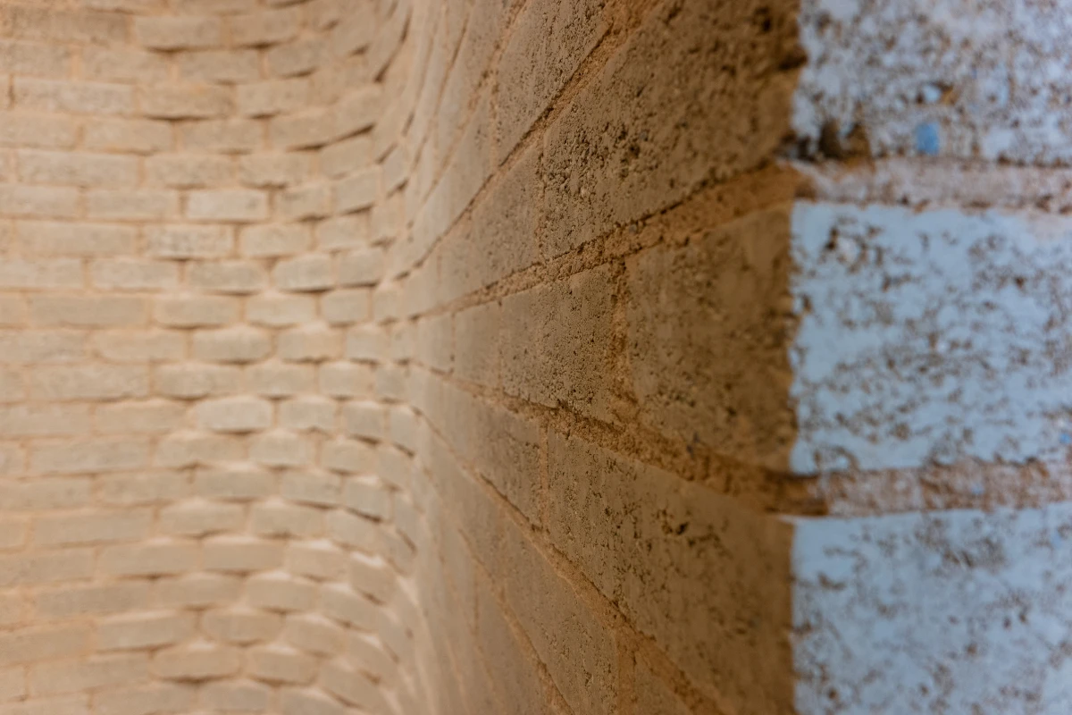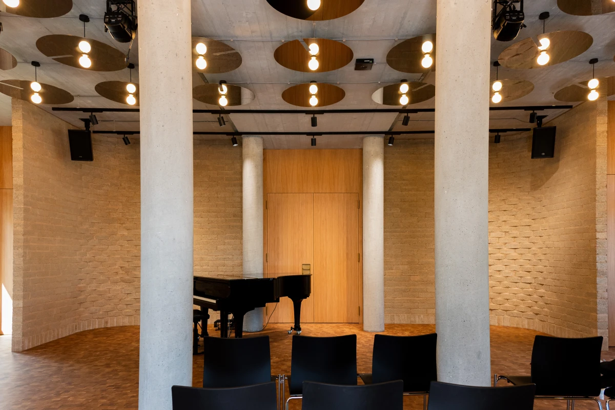 Um den Umbau und die Sanierung so ressourcenschonend wie möglich zu realisieren, setzen die Architekt:innen von Burckhardt auf gezielte Interventionen, wo sie notwendig sind. Überall dort, wo neue Materialien eingesetzt werden, sind diese weitestgehend natürlich, recycelt oder werden aus dem Bestand in neuer Form wiederverwendet. So wird eine gerundete Lehmziegelwand aus Oxablocs den zukünftigen Konzertsaal für bis zu 90 Personen in Szene setzen. Die gemeinschaftlich von Terrabloc und Oxara entwickelten Oxablocs werden mit Oxabrick® Loko, dem mineralischen Aktivator für stabilisierte gepresste Lehmsteine, hergestellt. Auf einer Fläche von rund 40m2 schaffen sie nicht nur für die Bühne einen optischen Rahmen. Die feuchtigkeitsregulierenden Eigenschaften der Lehmsteine sorgen zudem für ein gutes Raumklima an diesem Ort für Musik und Begegnung.