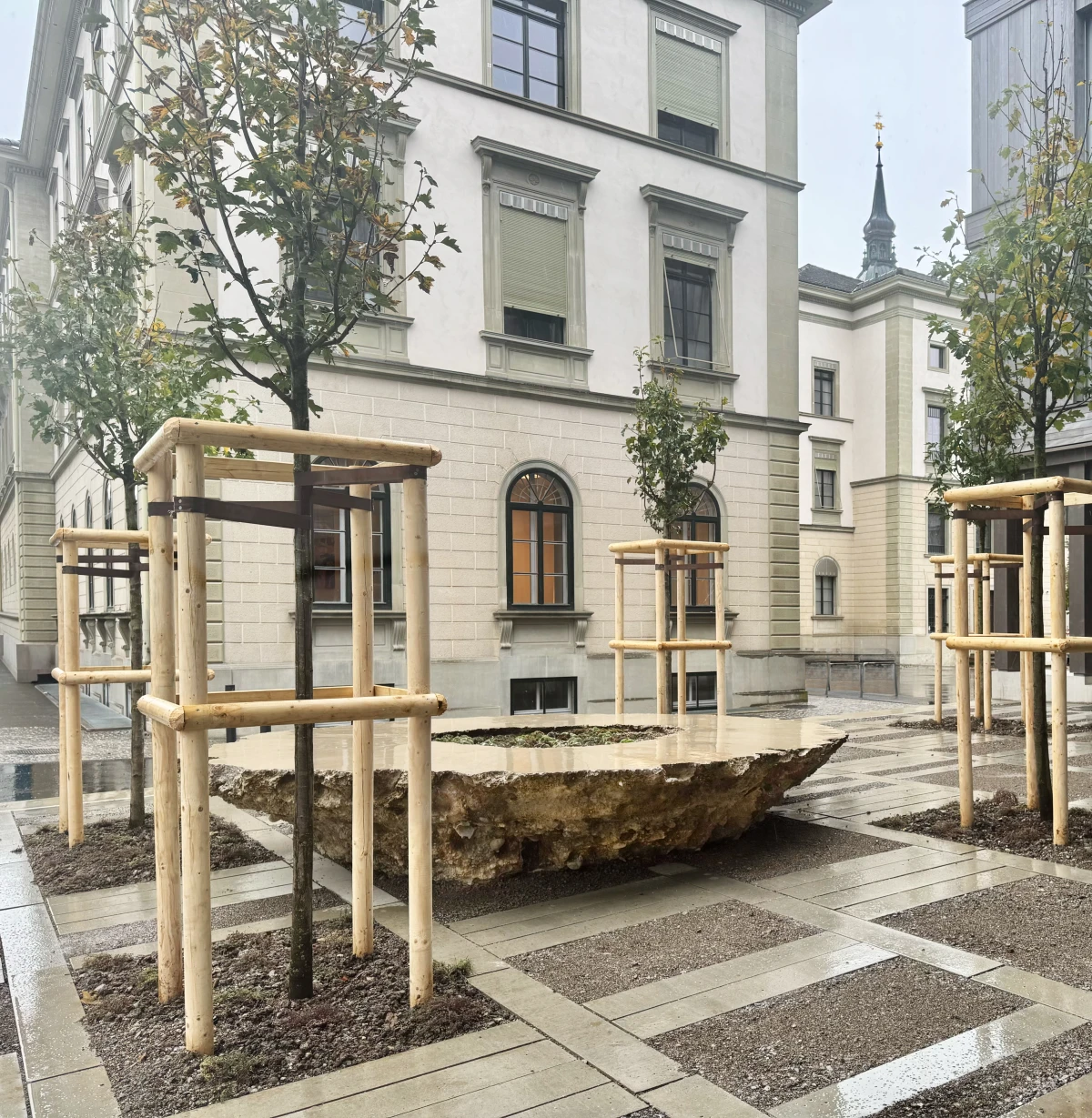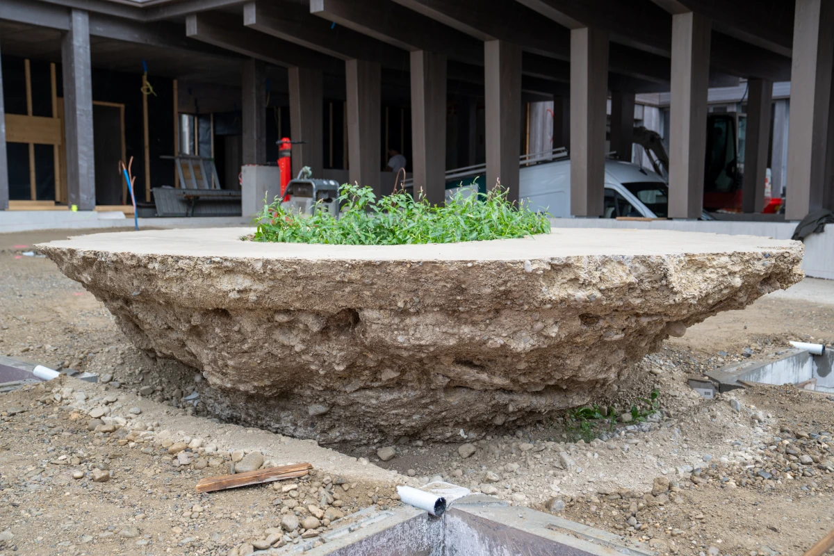 Together with artist Bob Gramsma and our industrial partner KIBECO, we explored this question at the government building in Frauenfeld. As part of the public art project round table, PD#24324, our cement-free Oulesse binder became an integral element of a large-scale sculptural installation.